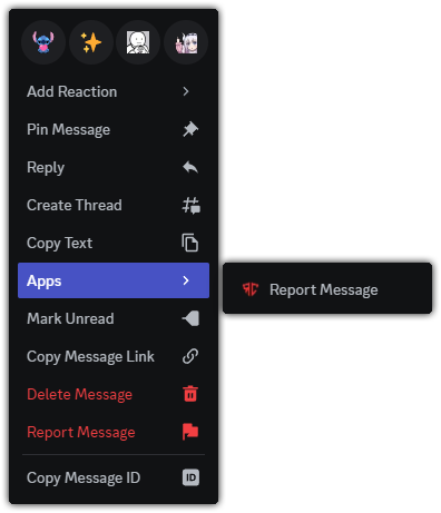 Pour signalé un utilisateur à l'équipe de RaidCleaner il vous suffit d'exécuter la commande d'application `Report Message` sur le message que vous souhaitez signaler.